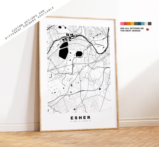 Esher Map Print - Minimalist City Map Poster - Map Art - UK - Esher Print - Esher Poster - Different Colours Available