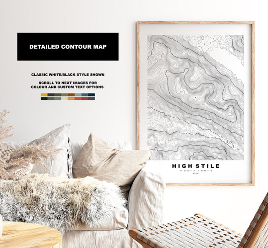 Contour map prints of the Lake District's peak and fells. These contour maps are very detailed, with height markers at 200m intervals and the summit marked where possible - so the larger size the better! These maps can be customised with two/three lines of text which replaces the coordinates at the bottom of the print. Perfect to mark a special occasion or for a personalised gift!