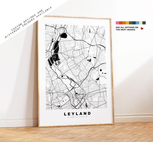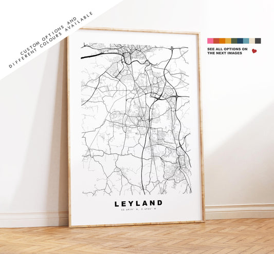 Leyland Map Print - Minimalist City Map Poster - Map Art - UK - Leyland Print - Leyland, Lancashire - Different Colours Available