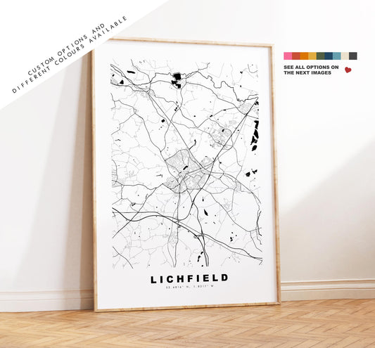 Lichfield Map Print - Minimalist City Map Poster - Map Art - UK - Lichfield Print - Lichfield, Staffordshire - Different Colours Available