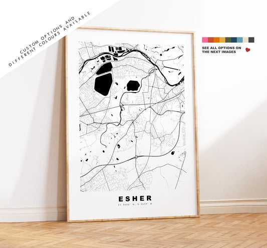 Esher Map Print - Minimalist City Map Poster - Map Art - UK - Esher Print - Esher Poster - Different Colours Available