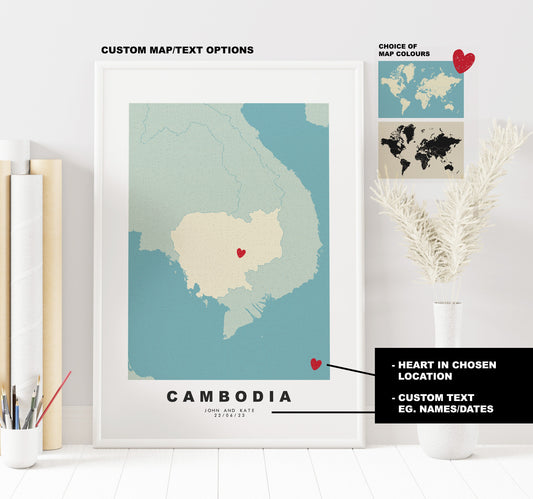 Cambodia Map Print - Personalised Map Gift - Framed or Canvas Options Available - Custom Text Options - Personalised Gift - Asia
