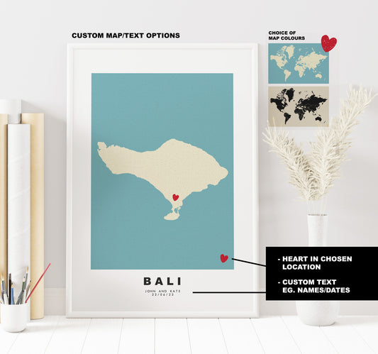 Bali Map Print - Personalised Map Gift - Framed or Canvas Options Available - Custom Text Options - Personalised Gift - Asia