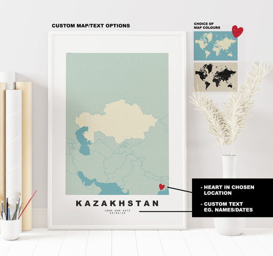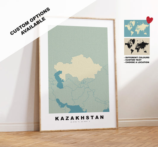 Kazakhstan Map Print - Personalised Map Gift - Framed or Canvas Options Available - Custom Text Options - Personalised Gift - Asia