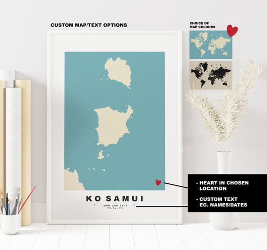 Ko Samui Map Print - Personalised Map Gift - Framed or Canvas Options Available - Custom Text Options - Personalised Gift - Asia