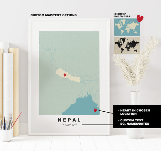 Nepal Map Print - Personalised Map Gift - Framed or Canvas Options Available - Custom Text Options - Personalised Gift - Asia