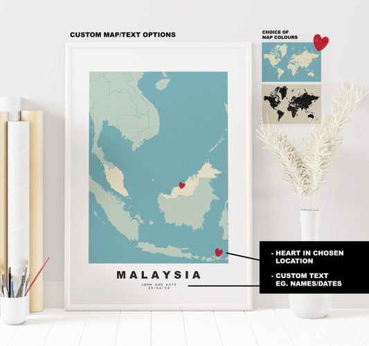 Malaysia Map Print - Personalised Map Gift - Framed or Canvas Options Available - Custom Text Options - Personalised Gift - Asia