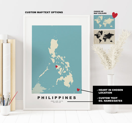 Philippines Map Print - Personalised Map Gift - Framed or Canvas Options Available - Custom Text Options - Personalised Gift - Asia