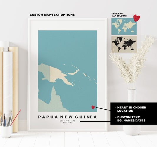 Papua New Guinea Map Print - Personalised Map Gift - Framed or Canvas Options Available - Custom Text Options - Personalised Gift - Asia
