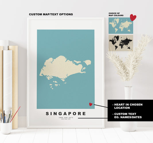 Singapore Map Print - Personalised Map Gift - Framed or Canvas Options Available - Custom Text Options - Personalised Gift - Asia