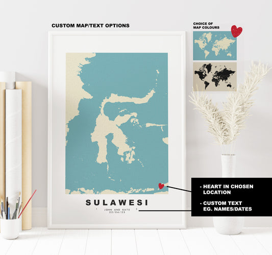 Sulawesi Map Print - Personalised Map Gift - Framed or Canvas Options Available - Custom Text Options - Personalised Gift - Asia