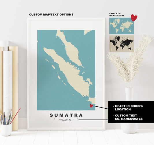 Sumatra Map Print - Personalised Map Gift - Framed or Canvas Options Available - Custom Text Options - Personalised Gift - Asia