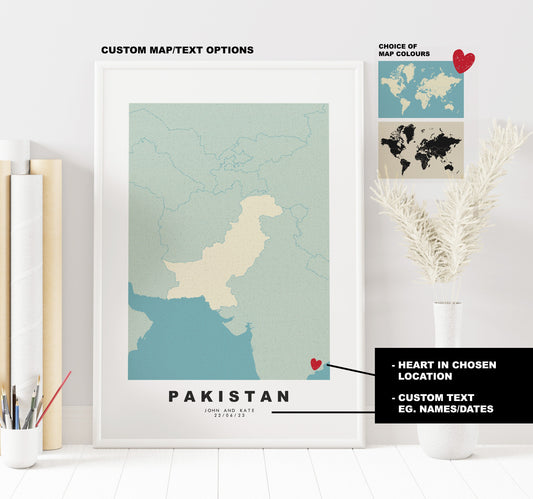 Pakistan Map Print - Personalised Map Gift - Framed or Canvas Options Available - Custom Text Options - Personalised Gift - Asia