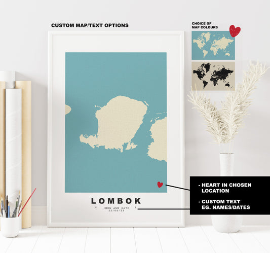Lombok Map Print - Personalised Map Gift - Framed or Canvas Options Available - Custom Text Options - Personalised Gift - Asia