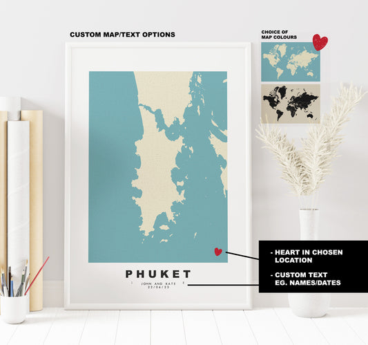 Phuket Map Print - Personalised Map Gift - Framed or Canvas Options Available - Custom Text Options - Personalised Gift - Asia