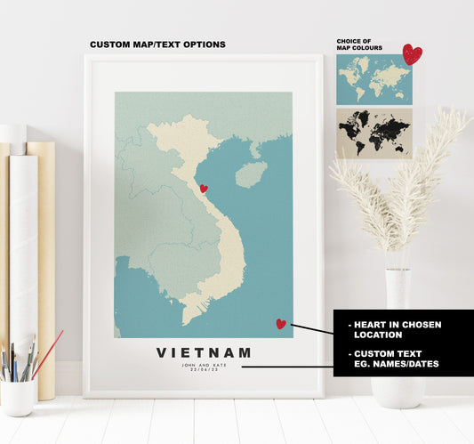 Vietnam Map Print - Personalised Map Gift - Framed or Canvas Options Available - Custom Text Options - Personalised Gift - Asia