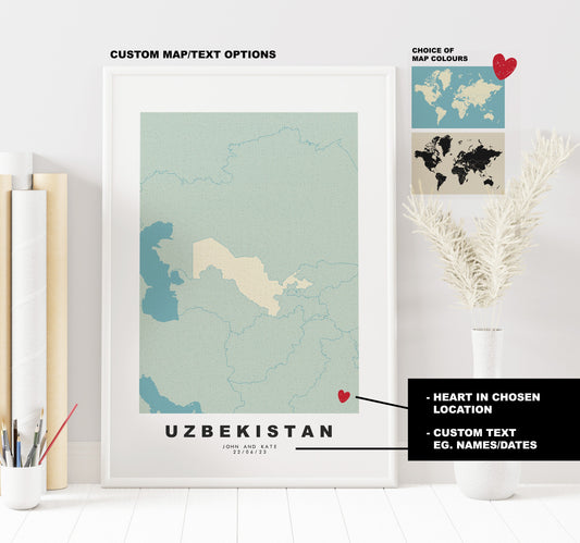 Uzbekistan Map Print - Personalised Map Gift - Framed or Canvas Options Available - Custom Text Options - Personalised Gift - Asia