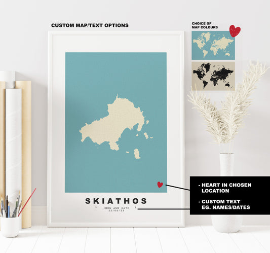 Skiathos Map Print - Personalised Map Gift - Framed or Canvas Options Available - Custom Text Options - Personalised Gift - Greece & Islands