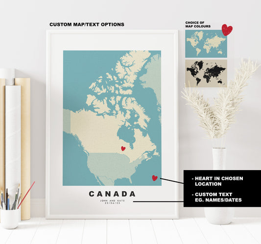Canada Map Print - Personalised Map Gift - Framed or Canvas Options Available - Custom Text Options - Personalised Gift - North America