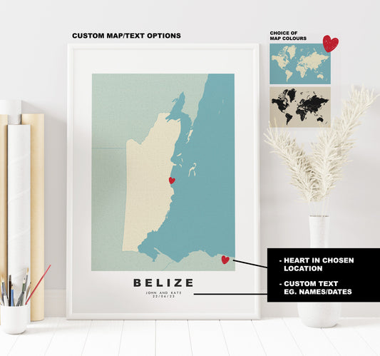 Belize Map Print - Personalised Map Gift - Framed or Canvas Options Available - Custom Text Options - Personalised Gift - South America