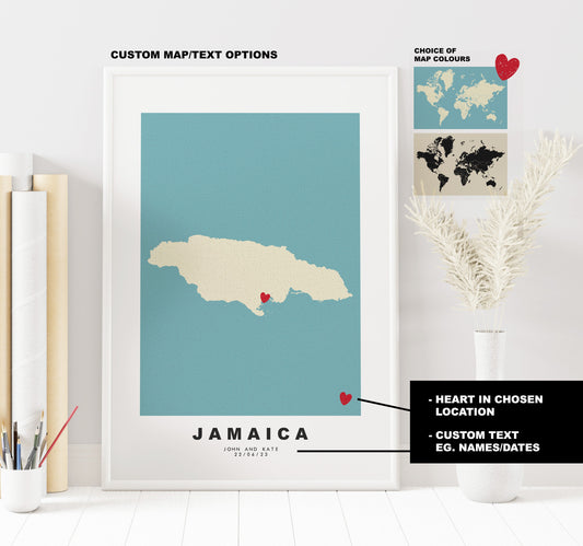 Jamaica Map Print - Personalised Map Gift - Framed or Canvas Options Available - Custom Text Options - Personalised Gift - Caribbean