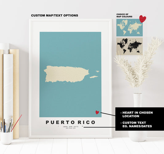 Puerto Rico Map Print - Personalised Map Gift - Framed or Canvas Options Available - Custom Text Options - Personalised Gift - US States & Islands - Caribbean