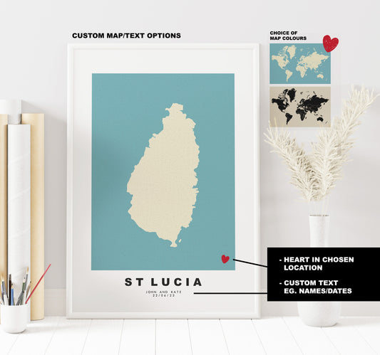 Saint Lucia Map Print - Personalised Map Gift - Framed or Canvas Options Available - Custom Text Options - Personalised Gift - Caribbean