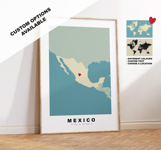 Mexico Map Print - Personalised Map Gift - Framed or Canvas Options Available - Custom Text Options - Personalised Gift - North America