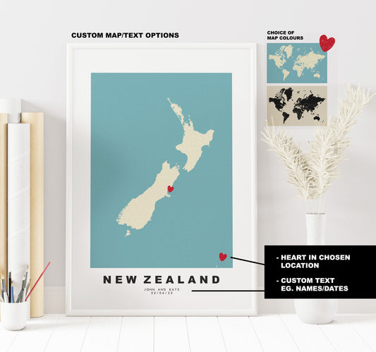New Zealand Map Print - Personalised Map Gift - Framed or Canvas Options Available - Custom Text Options - Personalised Gift - Oceania
