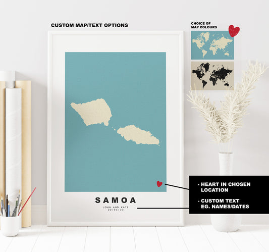 Samoa Map Print - Personalised Map Gift - Framed or Canvas Options Available - Custom Text Options - Personalised Gift - Oceania