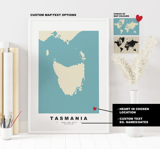 Tasmania Map Print - Personalised Map Gift - Framed or Canvas Options Available - Custom Text Options - Personalised Gift - Oceania