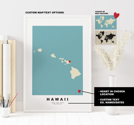 Hawaii Map Print - Personalised Map Gift - Framed or Canvas Options Available - Custom Text Options - Personalised Gift - US States & Islands