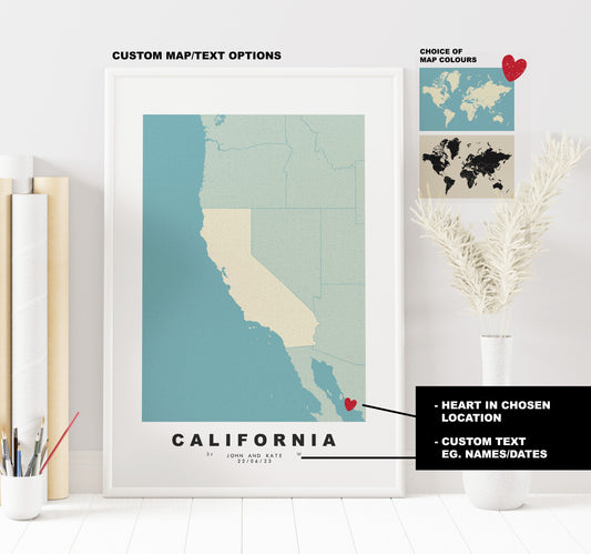 California Map Print - Personalised Map Gift - Framed or Canvas Options Available - Custom Text Options - Personalised Gift - US States & Islands