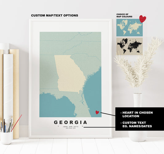 Georgia State Map Print - Personalised Map Gift - Framed or Canvas Options Available - Custom Text Options - Personalised Gift - US States & Islands
