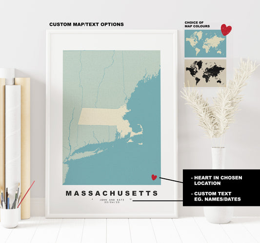 Massachusetts Map Print - Personalised Map Gift - Framed or Canvas Options Available - Custom Text Options - Personalised Gift - US States & Islands