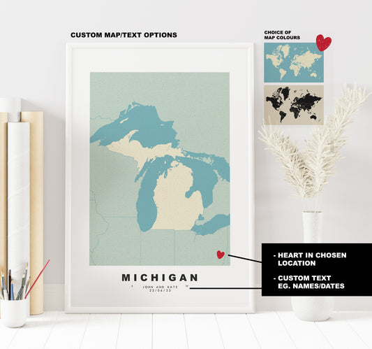 Michigan Map Print - Personalised Map Gift - Framed or Canvas Options Available - Custom Text Options - Personalised Gift - US States & Islands