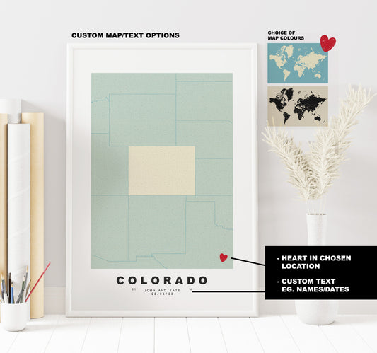 Colorado Map Print - Personalised Map Gift - Framed or Canvas Options Available - Custom Text Options - Personalised Gift - US States & Islands