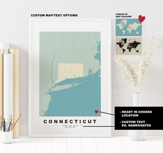 Connecticut Map Print - Personalised Map Gift - Framed or Canvas Options Available - Custom Text Options - Personalised Gift - US States & Islands