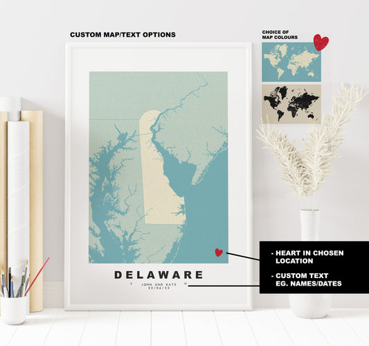 Delaware Map Print - Personalised Map Gift - Framed or Canvas Options Available - Custom Text Options - Personalised Gift - US States & Islands