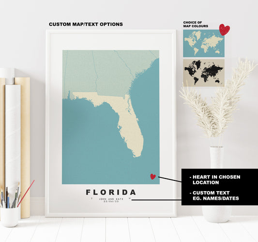 Florida Map Print - Personalised Map Gift - Framed or Canvas Options Available - Custom Text Options - Personalised Gift - US States & Islands