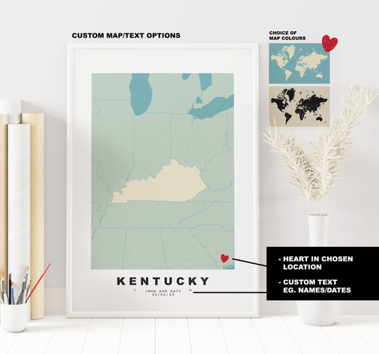 Kentucky Map Print - Personalised Map Gift - Framed or Canvas Options Available - Custom Text Options - Personalised Gift - US States & Islands