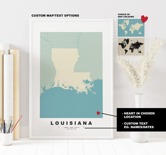 Louisiana Map Print - Personalised Map Gift - Framed or Canvas Options Available - Custom Text Options - Personalised Gift - US States & Islands