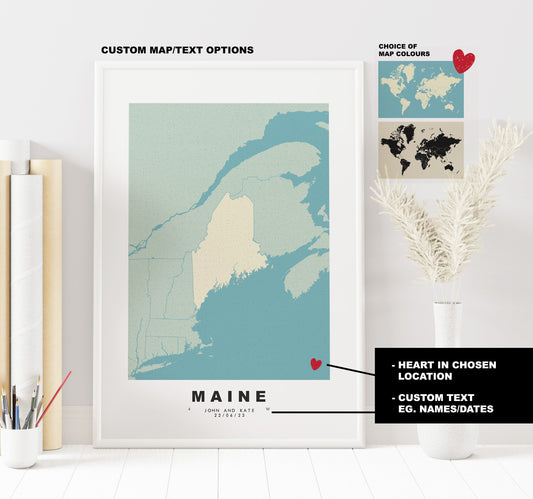 Maine Map Print - Personalised Map Gift - Framed or Canvas Options Available - Custom Text Options - Personalised Gift - US States & Islands