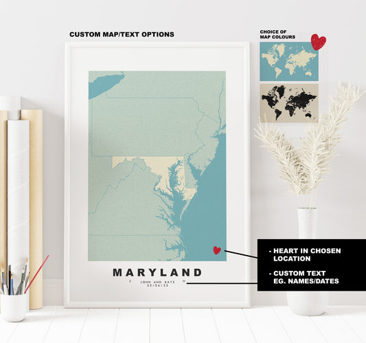 Maryland Map Print - Personalised Map Gift - Framed or Canvas Options Available - Custom Text Options - Personalised Gift - US States & Islands