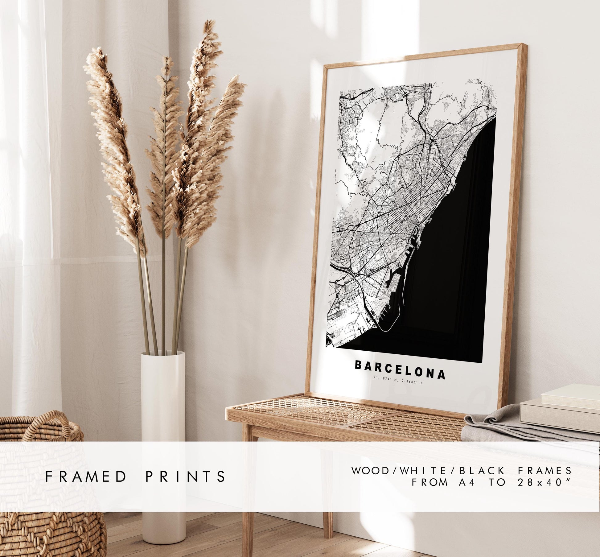 Map print in a minimalist black/white style or choose from a range of colours. These maps look great as a feature piece or as part of a set over a statement piece of furniture.