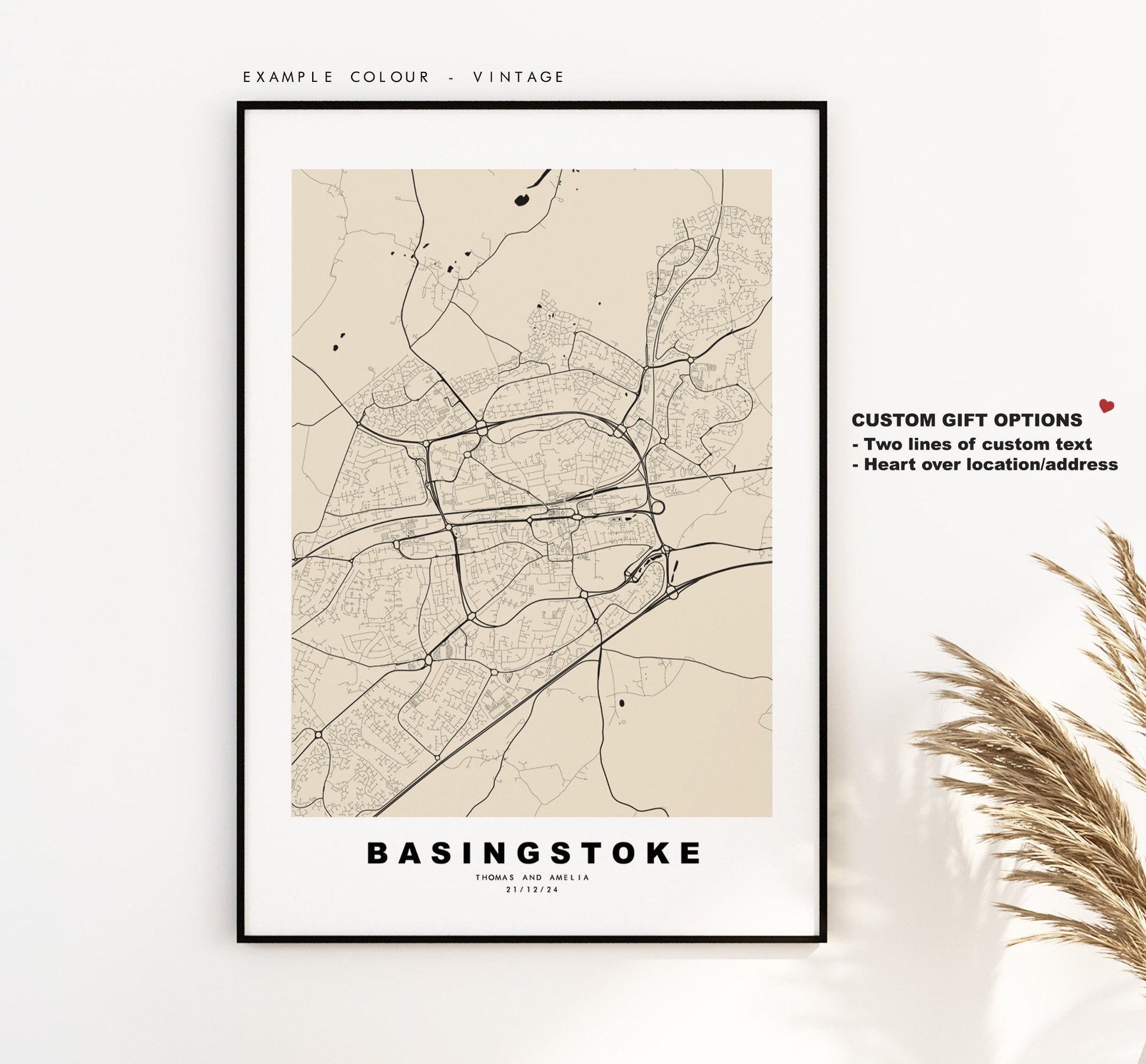 Basingstoke map in a minimalist black/white style or choose from a range of colours. These maps look great as a feature piece or as part of a set over a statement piece of furniture. You can personalise this print by adding up to two lines of custom text beneath the city title, or by adding a heart over a location or address.