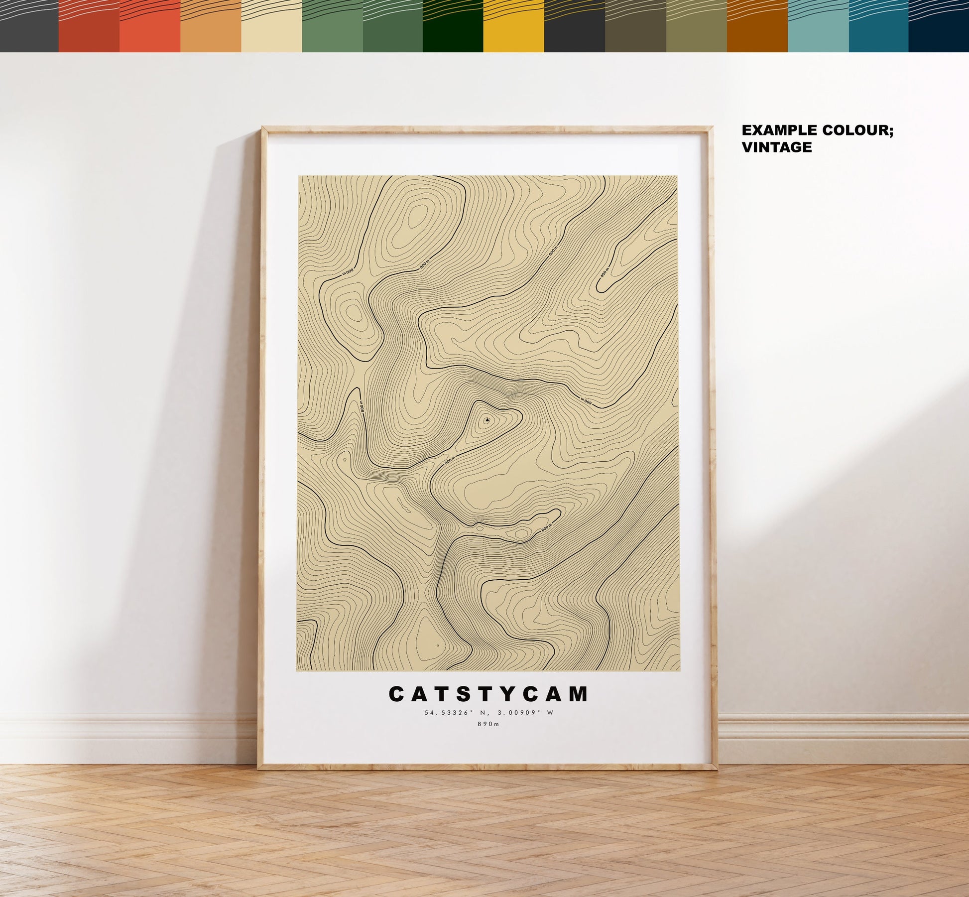Catstycam contour map in a minimalist style, available in classic white/black or in a choice of map colours (see listing images). These contour maps are very detailed, with height markers at 200m intervals and the summit marked where possible - so the larger size the better!