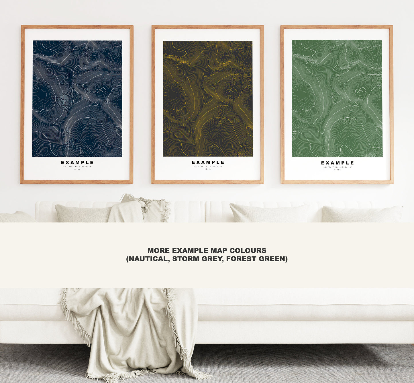 Contour map in a minimalist style, available in classic white/black or in a choice of map colours (see listing images). These contour maps are very detailed, with height markers at 200m intervals and the summit marked where possible - so the larger size the better!