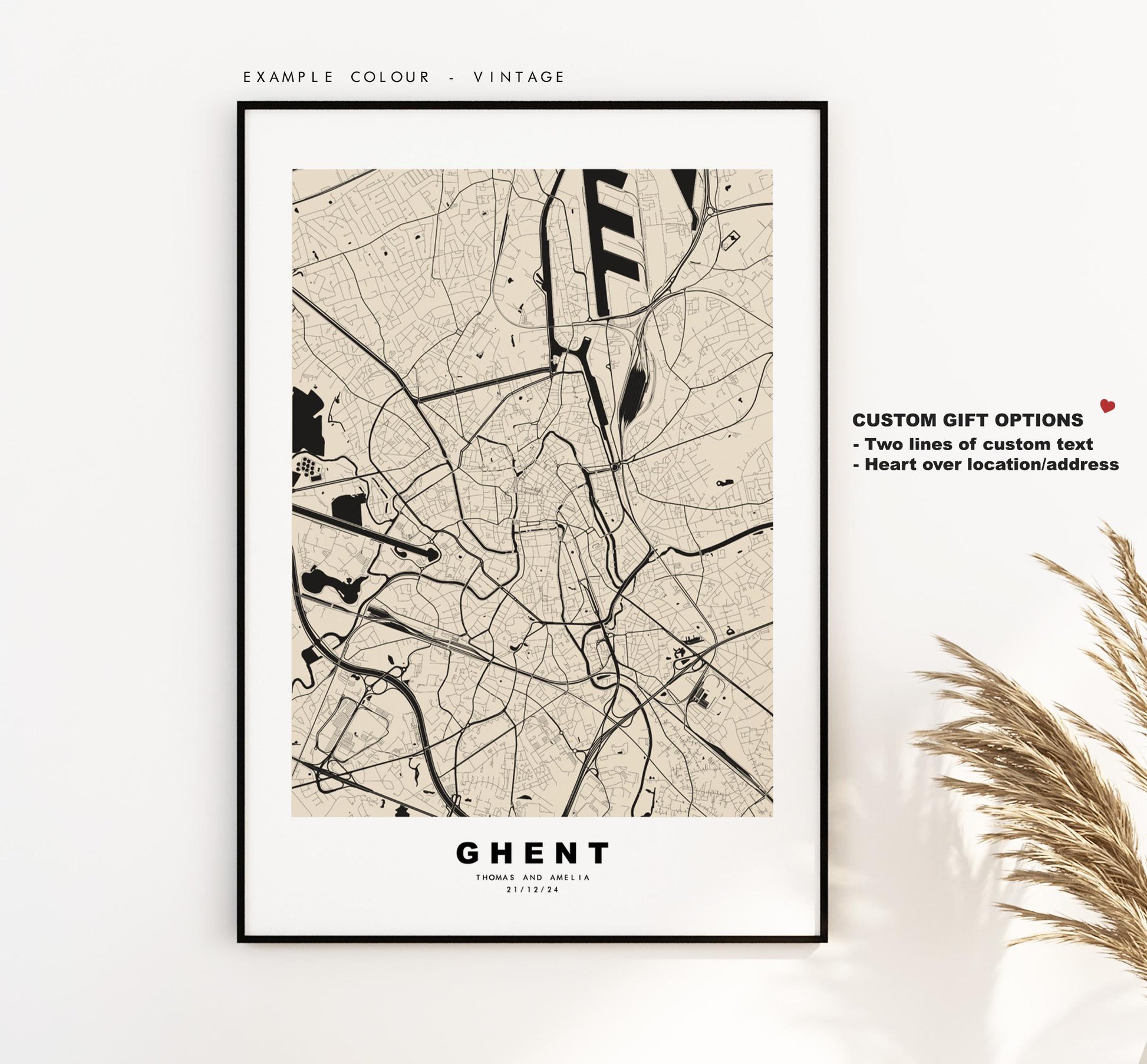 You can personalise this print by adding up to two lines of custom text beneath the city title, or by adding a heart over a location or address.