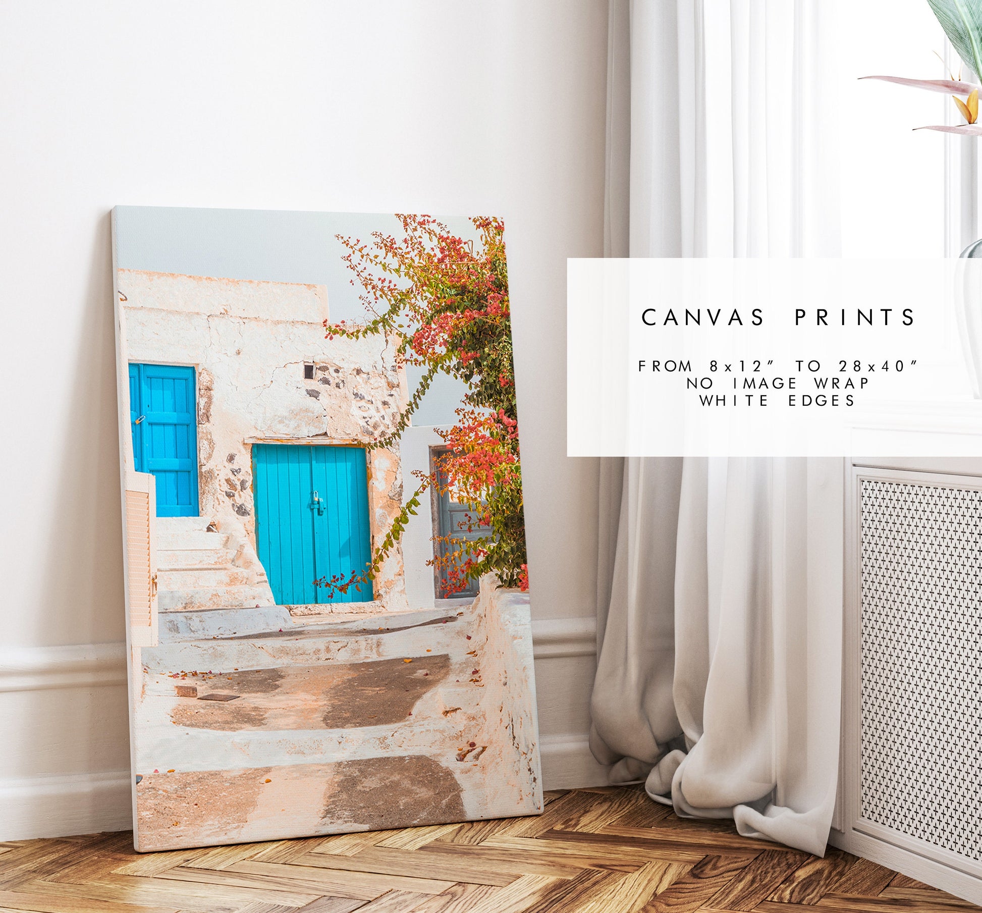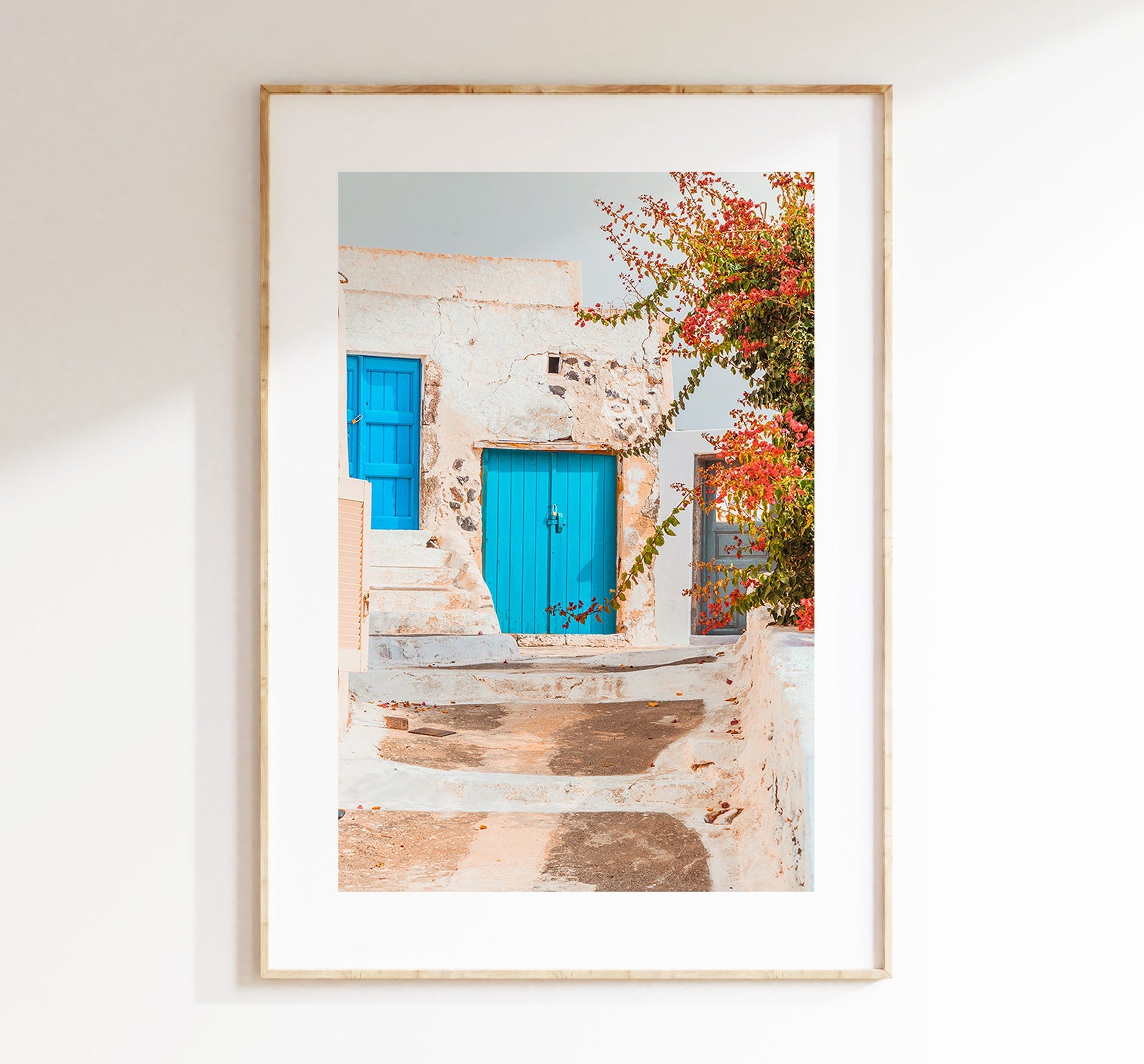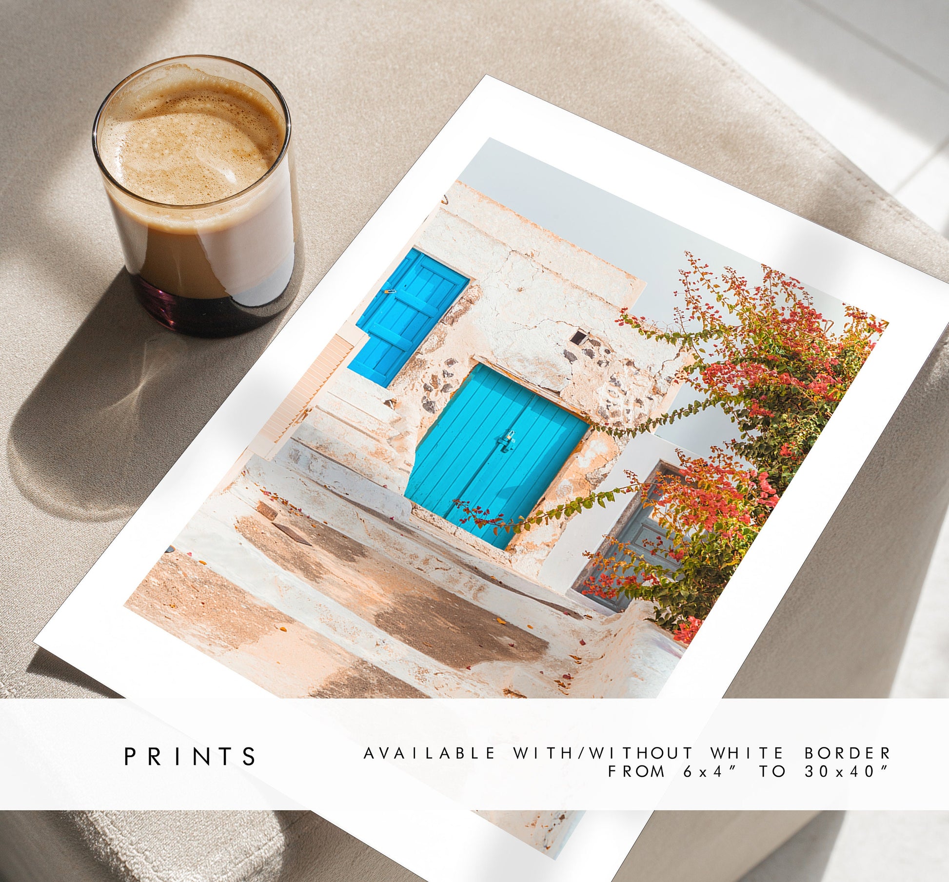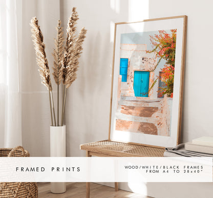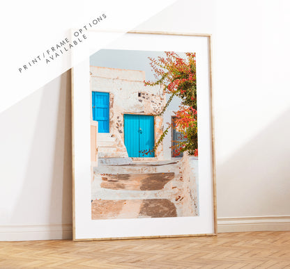 Greece Architecture Photography Print - Greece - Print - Poster - Santorini Photography - Greece Wall Art - Blue Door - Flowers - Greek Art